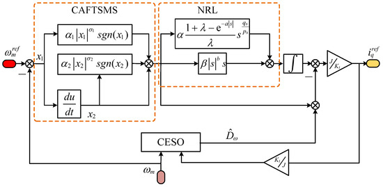 Both internal and external disturbances in the PMSM system severely impact its dynamic and steady-state performance. Moreover, the PMSM drive system is a multivariable, strongly coupled, and nonlinear system. Although traditional linear proportional integral (PI) controllers can meet some control requirements, they fall short of providing the high-precision speed control needed when the system is subjected to uncertain disturbances like internal parameter variations and external load torque fluctuations [6]. Consequently, extensive research has been carried out on various speed control strategies for PMSMs using modern control theory. These include fuzzy control [7], neural network control [8], sliding-mode control (SMC) [9,10,11,12], and active disturbance rejection control (ADRC) [13,14,15]. Among these, SMC is particularly favored in PMSM drive systems because it is independent of precise system models and highly resilient to external disturbances, significantly enhancing the system’s ability to withstand disruptions.