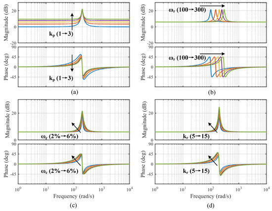 In this context, represents the resonant frequency, while denotes the bandwidth of the QPR controller. Additionally, and signify the proportional and resonant coefficients, respectively. The bode diagrams of the QPR controller with different parameters are shown in Figure 3. Each of the four sets of simulations changes only a single parameter in the QPR controller: (a) = 10, = 4%, = 200, = (1 to 3). (b) = 2, = 10, = 4%, = (100 to 300). (c) = 2, = 10, = 200, = (2% to 6%). (d) = 2, = 4%, =200, = (5 to 15).
