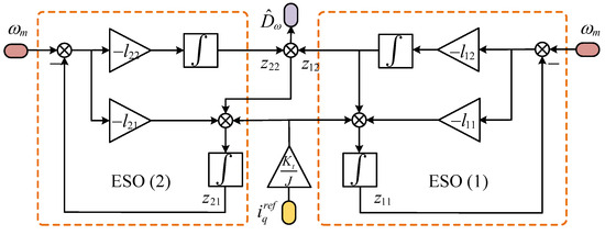 This study incorporates the QPR concept to enhance the attenuation of harmonic components in specific frequency bands related to particular order disturbances, thus improving the system’s ability to suppress periodic disturbances. The implementation of the ESO enhances the resilience of control systems against time-varying disturbances. There are two main strategies to improve the ESO’s ability to detect and mitigate these perturbations. The first is to increase the observer’s bandwidth, which minimizes estimation errors and improves dynamic responsiveness. Researchers have proposed various bandwidth adjustment methods, such as bandwidth-optimized deep-reinforcement learning [28] and adaptive bandwidth techniques [29]. The second strategy focuses on modifying the ESO’s structure. For example, elevating the ESO order vertically to effectively track sinusoidal disturbances is called the generalized ESO (GESO) [30]. Alternatively, augmenting the ESO levels horizontally to enhance disturbance-estimation performance is known as the cascaded ESO (CESO) [31].