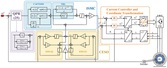 This paper improves the sliding-mode surface and reaching law of traditional SMC. The enhanced sliding-mode surface improves the system’s dynamic response and interference resistance. The new reaching law (NRL), incorporating adaptive function ideas, significantly increases the system’s convergence speed and dynamic performance. Additionally, due to the use of the adaptive function, the improved sliding-mode control (ISMC) presented in this paper enables the system to have a faster response speed and less speed fluctuation. Many researchers have conducted extensive studies to enhance control strategies for suppressing periodic disturbances and specific frequency resonances. Reference [23] proposed an approach to improve active disturbance rejection control (ADRC) for suppressing periodic disturbances in the current loop by combining self-oscillating and quasi-resonant (QR) controllers. The work in [24] introduced an extended state observer (ESO) to reduce periodic torque ripples by integrating a traditional innovative ESO with QR controllers. In [25], a QR controller was proposed to work with a modified ADRC system to reduce the primary harmonic component of torque ripple, facilitating smoother speed control. This strategy effectively suppressed torque ripples because the QR controller can generate a high control gain at the resonant frequency. Furthermore, ref. [26] presented an adaptive observer based on quasi-proportional resonance (QPR) to achieve a reaction potential with adaptive harmonic cancellation. It eliminating the error between the observed and actual currents in the reference system and enhancing observation performance. Finally, ref. [27] discussed combining a QPR controller with a super-twisted extended state observer (STESO) to reduce motor speed fluctuations.