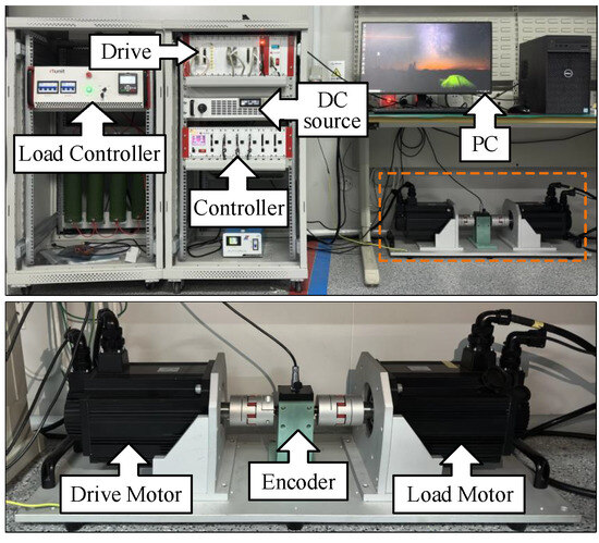 Correlation studies were conducted under constant speed, variable speed, and sud-den load conditions using a 2.2-kW surface permanent-magnet synchronous motor (SPMSM) experimental setup. This setup comprised a drive motor, load motor, DC power source, motor driver, encoder, PC, load controller, and main controller, which utilized a TI TMS320C28346 (Texas Instruments, Texas, USA) floating-point processor. A physical representation of the experimental platform is illustrated in Figure 6, in which a dual motor-to-drag loading mode was employed. The nominal specifications of the SPMSM are detailed in Table 1.
