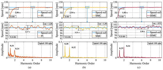 In the first experiment, the speed is set to 100 rpm. From Figure 7, it can be observed that the response times of the three control algorithms, PI, SMC, and ISMC, are 4.75 s, 2.86 s, and 1.83 s, respectively. The ISMC presented in this study demonstrates a notable advantage in terms of the response speed. The peak speed fluctuations in the steady-state phase of the three control algorithms are 4 r, 3.48 r, and 2.44 r. The proposed ISMC has less speed fluctuation in the steady-state phase, owing to the removal of the isochronous term applied in the conventional SMC. The fast Fourier transform (FFT) analysis of the speed also shows that the harmonic orders of the speed are mainly in the first and second orders and the proposed ISMC has the lowest amplitude. Meanwhile, the steady-state rotational speed of the ISMC proposed in this paper has a smaller variance.