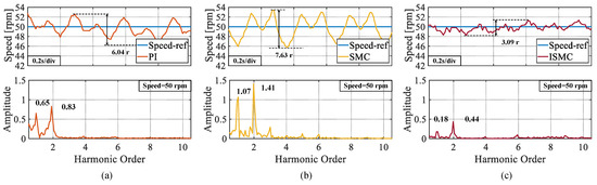In the second experiment, the speed was set to 50 rpm. As shown in Figure 8, the peak speed demonstrates in the steady-state phases of the PI, SMC, and ISMC were 6.17 r, 7.32 r, and 2.74 r, respectively. The ISMC proposed in this study also had less speed demonstrated in the steady-state phase. An FFT analysis of the experimental speed data with a set speed of 50 r also yields similar results to the 100 r experiment: the proposed ISMC exhibited the lowest amplitude at the first and second-order harmonics.