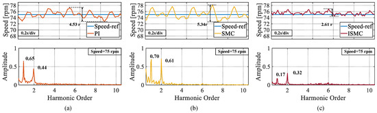 Steady state speed fluctuation values and FFT analysis of speeds at a set speed of 75 rpm. (a) PI. (b) SMC. (c) ISMC.
