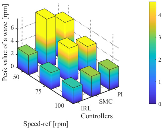 In the third experiment, the rotation speed was set to 75 rpm. From Figure 9, it can be observed that the peak speed demonstrate in the steady-state phases of the PI, SMC, and ISMC were 4.32 r, 2.76 r, and 1.88 r, respectively. The ISMC proposed in this study also had less speed demonstrate in the steady-state phase. The ISMC proposed in this paper also has less speed fluctuation value in the steady state phase. Figure 10 shows a comparison of the fluctuation peaks of the three algorithms at different speeds.