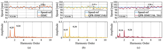 In this set of experiments, a QPR controller was added to the control algorithm. As can be seen from Figure 11, the amplitudes of the ISMC at the first and second-order harmonic amplitudes are 0.20 and 0.29, respectively, when the QPR controller is not added. After applying the QPR controller to the second-order harmonic, it is evident that the amplitude at the first-order harmonic amplitude was reduced to 0.12. After suppressing both the first and second-order harmonics, it can be seen that the first-order harmonic amplitude decreases to 0.13 and the second-order harmonic amplitude decreases to 0.22. These are 35.00% and 24.14% decreases in the first- and second-order harmonic amplitudes, respectively, compared with the control algorithm without applying the QPR controller.