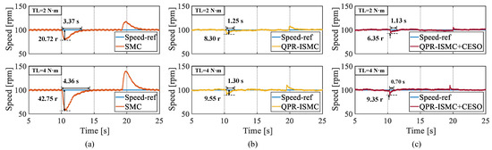 Through Figure 12, we can clearly see that when the load torque is 2 N·m, the maximum rotational-speed fluctuations of the three control algorithms are 20.72 r, 8.30 r, and 6.35 r, respectively, with regulation times of 3.37 s, 1.25 s, and 1.13 s, respectively. When the load torque is 4 N·m, the maximum rotational-speed fluctuation values for the three control algorithms are 42.75 r, 9.55 r, and 9.35 r with regulation times of 4.36 s, 1.30 s, and 0.70 s, respectively. It can be concluded that the proposed ISMC has a strong anti-disturbance capability, and introducing CESO further enhances the system’s ability to overcome time-varying disturbances.