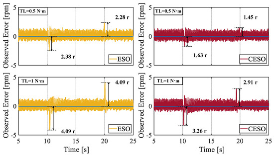 To verify the superiority of the proposed CESO over the traditional ESO, in the second set of experiments, applying the same load torque and selecting the same observer bandwidth , the fluctuation situation of the observed values was observed. It can be seen from Figure 13 that when the same load was applied, for different magnitudes of the load set values, the peak values of the observation fluctuations of the CESO were, respectively, reduced by 31.51% and 20.34%, compared with those of the ESO. When the load was unloaded, they decreased by 40.79% and 28.85%, respectively. By comparison, we can conclude that the proposed CESO has a stronger observation ability than the traditional ESO.