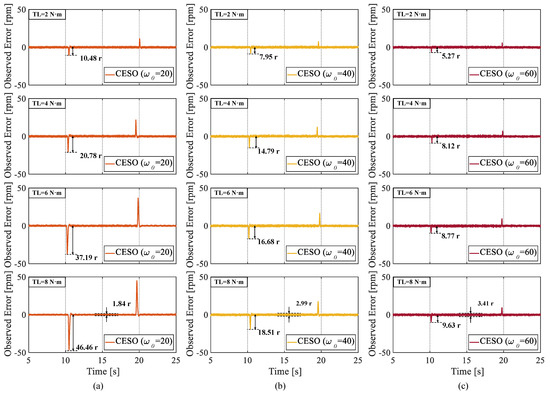The third set of experiments was conducted to verify the superior performance of the proposed CESO to observe the rotational speed. Through Figure 14, we can clearly see that the proposed CESO has a smaller observation error, has a strong ability to observe the rotational speed, and the peak of the observer’s observation-error fluctuation shrinks when a larger observer bandwidth is selected. However, it is worth noting that the peak of the observer’s observation-error fluctuation is reduced when a larger observer is selected. However, when a larger observer bandwidth is selected, the observation-error fluctuation value in the steady-state phase becomes larger, which suggests that we should reasonably select the controller bandwidth .