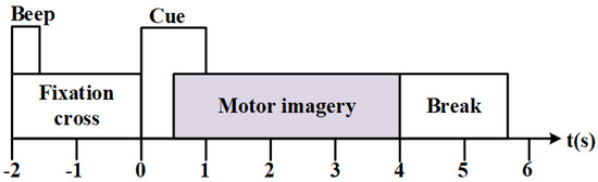 The BCI-IV Dataset 2a comprises EEG data from nine subjects (A01-A09), with each subject performing 576 motor imagery tasks. Each task lasted approximately 8 s, including a 2-s task warning period, a 4-s motor imagery period, and a 2-s rest period. EEG signals were recorded from twenty-two channels at a sampling frequency of 250 Hz. Post-acquisition, bandpass filtering from 0.5 to 100 Hz and 50 Hz notch filtering was applied (Figure 1).