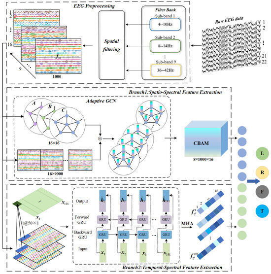 Understanding the crucial importance of channel connectivity, temporal dependency, and frequency domain information in MI-EEG for enhancing decoding performance [13,14], we propose a novel dual-branch network architecture that integrates these dimensions for a comprehensive analysis. One branch uses Adaptive GCN to establish the connectivity between channels, capturing the synchronization state and dynamic process of the brain, and employs a Convolutional Block Attention Module (CBAM) to focus on important features, achieving spatial–spectral feature extraction. The other branch employs temporal convolution to serialize the MI-EEG, utilizing bidirectional gated recurrent unit (Bi-GRU) and multi-head self-attention mechanisms to extract deep temporal-spectral features from the dependency relationships in the sequence. Feature fusion is then performed. The main contributions of our work are as follows: