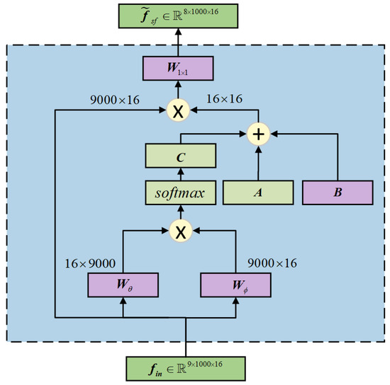 Bi-GRU computes the hidden states and from the forward and backward directions, and concatenates them to obtain the temporal–spectral feature , which contains both forward and backward dependencies. To improve the model’s capacity to capture long-range dependencies within the sequences, the MHA [33] is employed to capture global dependencies among . The MHA module performs self-attention computations with multiple attention heads and outputs the final temporal–spectral feature following a linear transformation; represents the weight matrix.