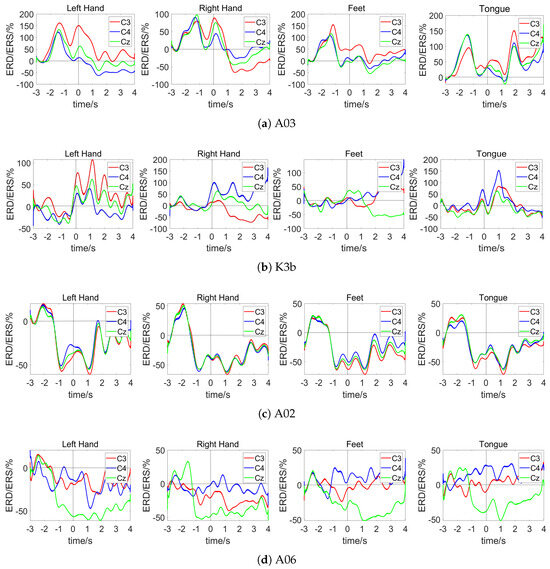 Figure 5a,b illustrate the ERD/ERS characteristic curves for subjects A03 and K3b, respectively. During motor imagery, movements of the left hand, right hand, both feet, and tongue generally exhibit distinct ERD/ERS characteristics, resulting in better classification outcomes. Figure 5c presents the ERD/ERS characteristic curves for subject A02, where consistent trends and similar energy changes are observed in the C3, C4, and Cz channels during different imagined movements. Figure 5d displays the ERD/ERS characteristic curves for subject A06, where significant ERD is observed in the Cz channel across all the proposed method’s imagined tasks, with consistent trend patterns. These results indicate that subjects A02 and A06 did not elicit corresponding responses in the brain regions associated with different limb movements, lacking separability and resulting in poor classification outcomes.