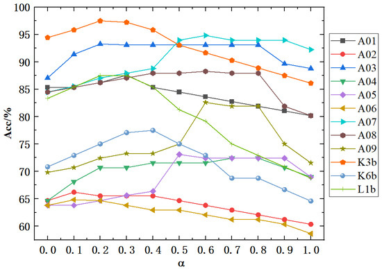 Introducing the self-connection coefficient aims to enhance the utilization of self-channel information, with its value ranging from 0 to 1. To verify the impact of the self-connection coefficient on classification results, we tested values at intervals of 0.1. As shown in Figure 6, classification accuracy increases with the self-connection coefficient for most subjects, reaching a peak before decreasing. This indicates that placing too much or too little emphasis on the node’s information can negatively affect classification performance. The optimal self-connection coefficient varies among subjects, with values of 0.3, 0.1, 0.2, 0.7, 0.5, 0.1, 0.6, 0.6, 0.6, 0.2, 0.4, and 0.2, reflecting the individual differences among the subjects.