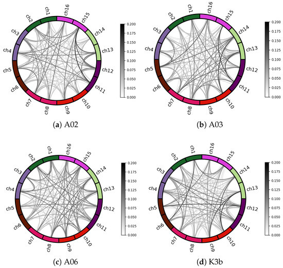 Spatial correlation connectivity maps. The outer circle is different EEG channels, the inner circle lines indicate the connectivity properties of different channels, and the darker color of the lines represents the greater correlation between the channels.