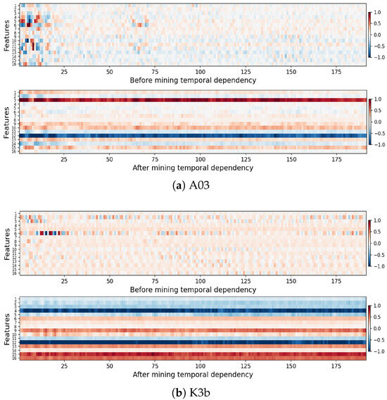 To observe the impact of temporal dependencies on features, the features before capturing temporal dependencies and features after capturing them for all samples of each subject were obtained, and the feature mean was calculated along the sample dimensions for visualization. The visualization for subjects A03 and K3b is shown in Figure 8. The horizontal axis displays sequences from various time windows, each aggregating data from 50 sample points (0.2 s time window), and the vertical axis represents the sequence features.