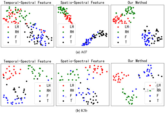 To visually demonstrate the classification effect of feature fusion, the t-SNE [41] method was used to embed the temporal–spectral features, spatial–spectral features, and fusion features (our method) into two-dimensional scatter plots to observe the degree of feature separation. Figure 9a shows the visualization results of subject A07. For temporal–spectral features, different tasks overlap significantly. For spatial–spectral features, the separability between left- and right-hand tasks and between feet and tongue tasks is poor. The inter-class distances between tasks are increased after feature fusion significantly. Figure 9b shows the visualization results of subject K3b. From the temporal–spectral and spatial–spectral features, it can be seen that the left- and right-hand tasks introduce other individual samples. However, after feature fusion, the left- and right-hand tasks are completely separated from the other tasks. This result indicates that integrating the time, frequency, and spatial domain information of MI-EEG can enhance the separability of different tasks.