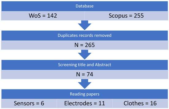 The date of publication of the selected papers was between 2020 and 2024. Journal papers and conference papers were considered. The research direction for the paper was electrophysiological monitoring using smart textiles and the scope was limited to textile electrodes, smart clothes, and sensor technology with respect to textiles.