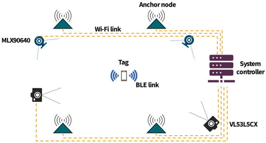 The proposed BLE-IR localization system consists of four major elements: localized tags that transmit BLE frames, a fixed infrastructure comprising anchor nodes acting as receivers, independently working IR sensors, and a system controller responsible for the position calculation. The proposed architecture is shown in Figure 1.