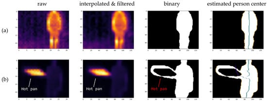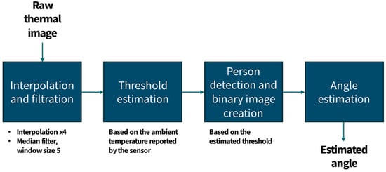 The MLX90640 outputs low-resolution (32 × 24 pix) thermal images, which allows for the estimation of the angle between the sensor and the localized person. The algorithm for angle estimation is based on [37]. The algorithm flow is presented in Figure 2. An illustration of the data processing in the two scenarios is presented in Figure 3.