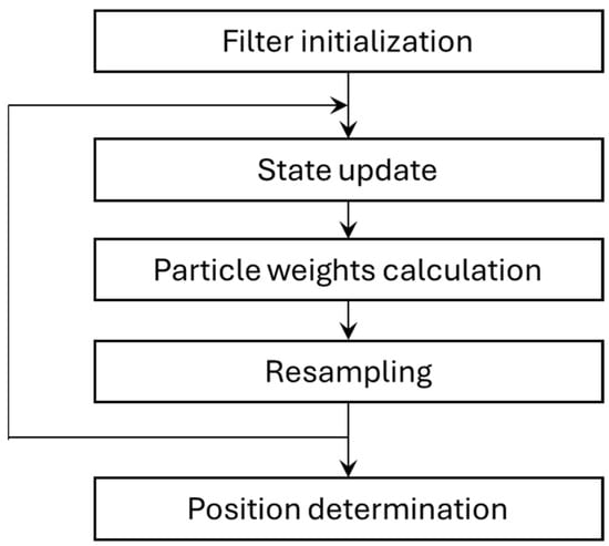 The positioning algorithm used in the system is a particle filter (PF) [38] implementation. The algorithm consists of the typical steps presented in Figure 5: