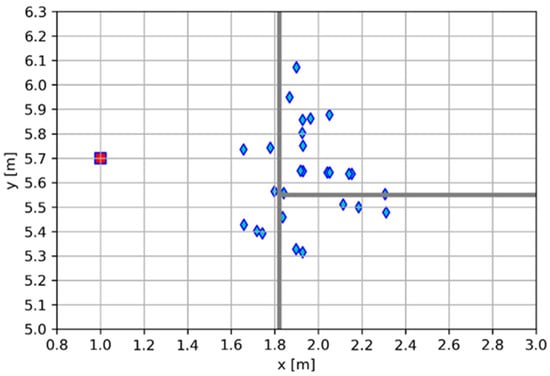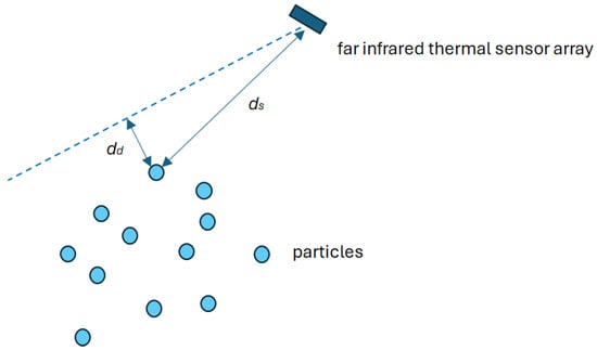 The far-infrared thermal sensor array’s readings can be used to evaluate the angle between the sensor and the localized person. When in the range of the sensor, the particle weights are updated based on Equations (11)–(13):