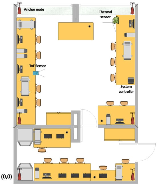 The BLE anchor nodes were placed in the corners of the room near the ceiling to provide unobstructed propagation conditions, with the two anchor nodes placed in the adjacent room. The thermal sensor was placed in the corner of the room to achieve the best possible coverage. Due to its limited range, the ToF sensor was placed on a table, facing the center of the room. The origin of the coordinate system was such that the point (0,0) was in the lower-left corner of the smaller room.