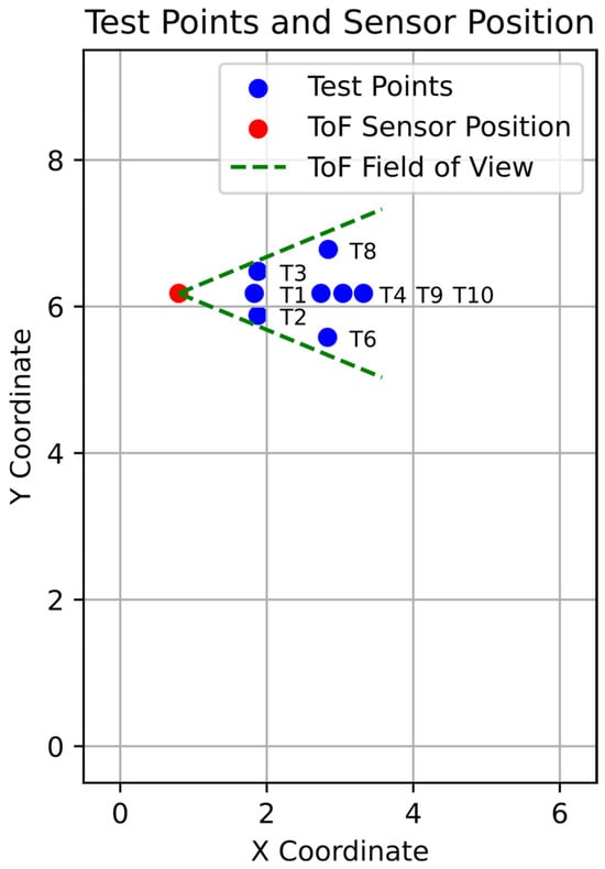 Similarly, as for the MLX90640, the proposed angle estimation method for the VL53L5CX was tested under static conditions. Yet again, the person stood motionless in front of the sensor at eight test points, as shown in Figure 10.