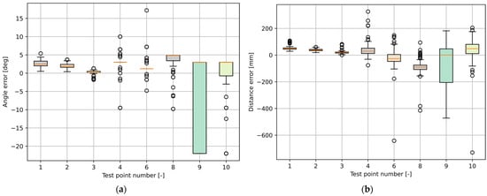 Boxplots of the angle estimation errors are shown in Figure 11a, and the distance measurement errors are shown in Figure 11b.
