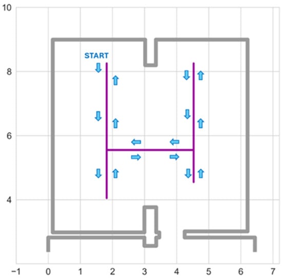 The tests consisted of the localization of a tag worn on a lanyard by a person who followed a predefined path (Figure 12). They maintained a constant speed while walking. The test path was composed of straight lines. The times to reach characteristic trajectory points were collected during the trials. As all of the results (the BLE signals and sensor results) were acquired at the same rate, this allowed us to determine the approximate location of the test points at which the measurements were taken. The total path length, equal to 22 m, was traveled in 63 s, so the distance between test points was close to 9 cm.