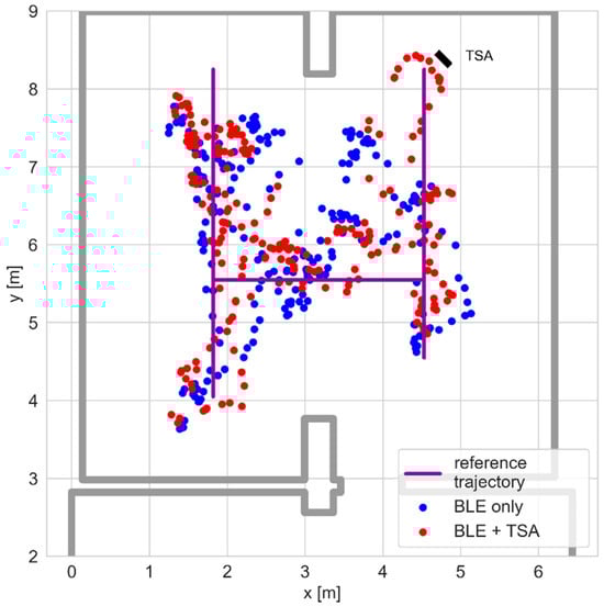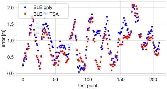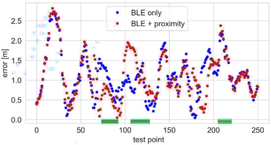The positioning errors are shown in Figure 15. Due to the limited sensor range, its influence can be seen only for points close to the sensor (marked green). At the start and end of the test, the errors are almost the same because both algorithms only use the BLE results.