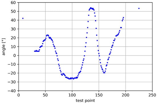 The thermal sensor array (TSA) was located close to the corner of the room to cover almost the whole test path. Figure 17 presents the angles recorded during the test. The lack of results at the beginning and the end of the test was caused by the person moving outside of the area covered by the sensor.