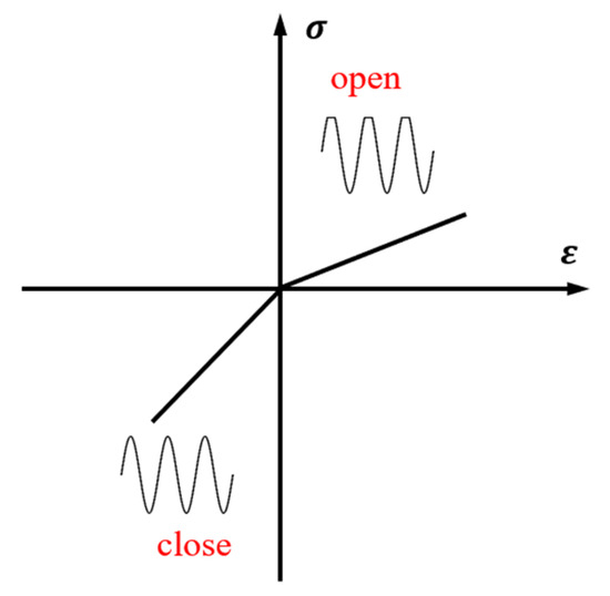 Nonlinear ultrasonic techniques can detect the nonlinear effects induced by contact acoustic nonlinearity (CAN), hysteresis, and energy dissipation [28]. CAN primarily originates from the clapping effect or Hertzian contact [29]. When an ultrasonic wave encounters a micro-crack, the micro-crack closes under compression, increasing local stiffness, and opens under tension, decreasing local stiffness, as shown in Figure 1. The “clapping effect” of the micro-crack results in alternating changes in the local stress–strain relationship, which modulates the input ultrasonic wave and induces new harmonic components known as ultrasonic nonlinear responses [30,31].