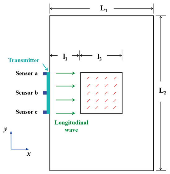 To excite the longitudinal plane waves modulated by a Hanning window, the dynamic displacement at the left end of the FEM model can be expressed as , where = 1 × 10−3 mm is the excitation signal amplitude, = 1 MHz is the center frequency, and = 10 is the number of cycles per excitation signal. To balance computational efficiency and accuracy, the maximum element size was set to = 0.1 mm, not exceeding 1/20 of the excitation signal wavelength. Each micro-crack spanned at least 5 elements. The FEM model utilized four-node plane strain (CPE4R) elements. The ABAQUS/Explicit solver, based on the central difference method, simulated longitudinal plane wave propagation. Considering the need for numerical convergence and the total calculation time, the total analysis time was set to be 6.5 × 10−5 s, and the stable time increment Δt was set to be 2 × 10−9 s. Three receiving points, serving as ultrasonic sensors , , and were positioned at 20 mm intervals along the model’s left end to receive the original ultrasonic responses , , and . The orientation angle of each micro-crack between the principal direction of the micro-crack and the positive direction of the x-axis was 45°. The spacing between the crack centers was maintained to be approximately equal, as shown in Figure 2.