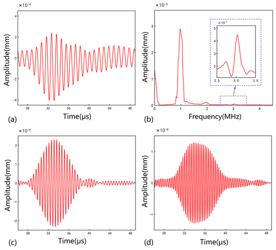 where ≈ 6127 m/s is the propagation velocity of the excited longitudinal plane waves, and ≈ 6127 m/s is the propagation speed of the crack-information-bearing response. This interval was determined to be [26.1 μs, 49.1 μs]. The original ultrasonic response signals were thus truncated to this interval, reducing the signal length from 15,000 to 4760 points, resulting in new ultrasonic responses , , and . Taking the FEM model with 210 micro-cracks of 0.8 mm as an example, the truncated is shown in Figure 3a. The corresponding frequency domain is shown in Figure 3b. The second-harmonic nonlinear response was extracted from using a Chebyshev bandpass filter, with the center frequency and the bandwidth 2 MHz and 0.2 MHz, respectively, as shown in Figure 3c. The third-harmonic nonlinear response corresponds to 3 MHz and 0.2 MHz, as shown in Figure 3d.