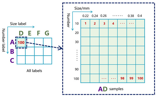 Prior to importing nonlinear responses into deep learning models, it is necessary to reasonably set subtle parameter labels and establish the sample sets. Considering the time and difficulty of sample collection, we set the minimum detectable size of the micro-cracks to be 0.22 mm. Additionally, to highlight the advantages of the nonlinear ultrasonic methods in detecting micro-cracks below half-wavelength, the maximum detectable size was set to 1.00 mm. The length of the subtle parameter interval determines the precision of identification (rather than accuracy. To balance identification precision and sample acquisition difficulty, we set the quantity parameter identification range between 10 and 300, divided into three contiguous intervals labeled “A”, “B”, and “C”. The size parameter identification range was divided into four contiguous intervals labeled “D”, “E”, “F”, and “G” (Table 1). Our goal is to classify more test samples into correct intervals to evaluate the RUL interval in conjunction with the life prediction model [32,33].