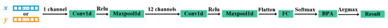 For brevity, in this paper, the annotations following all convolutional layers indicate four hyperparameters: the number of input channels, the number of output channels, the convolutional kernel sizes, and the strides, respectively. For the max-pooling layers, they indicate the pooling kernel sizes and the strides. To enhance the neural network’s nonlinear capabilities, we applied a Rectified Linear Unit (ReLU) activation function after each convolutional layer. As shown in Figure 5, after initial optimization, the hyperparameters of each layer in the 1D CNN architecture along the direction of the arrows were set to Conv1d (1, 12, 3, 1), Maxpool1d (4, 2), Conv1d (12, 24, 3, 1), and Maxpool1d (4, 2).