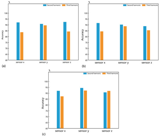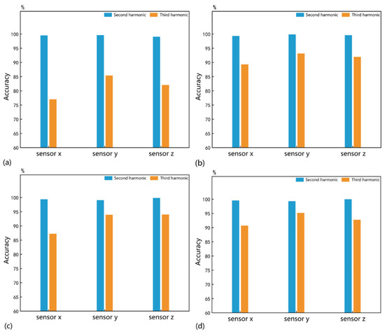 We also propose another data-level fusion method, as shown in Figure 9b. In this method, the second and third harmonics were fed into the 1D CNN through two separate channels. The hyperparameters were set to Conv1d (2, 12, 3, 1), Maxpool1d (4), Conv1d (12, 24, 3, 1), Maxpool1d (4), and FC (7104, 12). It took 24.92 s to train the 1D CNN for 600 epochs. The decoupled identification accuracies obtained over 100 training sessions, using the same method as before, are shown in Figure 8, with sensors , , and achieving 92.96%, 91.74%, and 91.08%, respectively.