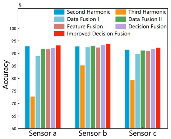 In summary, our improvement method proposed in this paper enhances the rationality of the decision fusion process and improves the accuracy of the decision results. Therefore, we re-fused the BPAs provided by the two nonlinear responses. The label with the highest fused BPA value was taken as the identification label. As shown in Figure 8, the mean identification accuracies over 100 training sessions for sensors , , and are 93.73%, 93.13%, and 92.24%, respectively, which represent improvements of 0.51%, 0.93%, and 0.59%, respectively, compared to the classic Dempster combination rule. This proves that our improvement method proposed in this paper reasonably uses the beneficial information from different nonlinear responses, thereby enhancing the identification performance of each sensor.