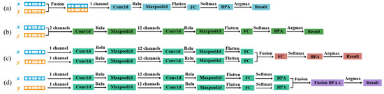 Different from directly fusing the raw data, feature-level fusion perceives and makes decisions by fusing deep features extracted from the raw data [39]. As shown in Figure 9c, the second and third harmonics were separately fed into two independent and identical 1D CNNs for feature extraction. The 1D CNNs used here are similar to the one shown in Figure 5, with the network architecture hyperparameters set to Conv1d (1, 12, 3, 1), Maxpool1d (4, 2), Conv1d (12, 24, 3, 1), Maxpool1d (4, 2), and FC (7104, 12). The outputs of the two FCs were algebraically summed to fuse features from different nonlinear responses. It took 43.32 s to train the two 1D CNNs for 600 epochs. The decoupled identification accuracies were obtained over 100 training sessions using the same method as before and are shown in Figure 8, with sensors , , and achieving 92.31%, 91.58%, and 90.82%, respectively. Thus, it can be observed that neither data-level nor feature-level fusion has demonstrated a significant advantage. The specific reasons for this are not explored in depth in this paper.