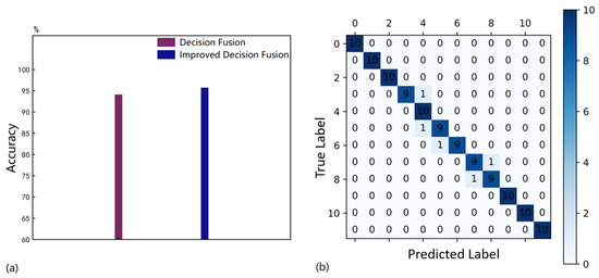 The purpose of measuring conflicts is to determine the weights of the sensors, as shown in (18)–(22). We propose a method of normalizing the conflict functions to assign the sensor weights , , and . Although each sensor’s weight may vary greatly, this variation largely stems from the extreme probability values in the BPAs provided by sensors. Unlike the previous part, there are only two nonlinear responses in the decision fusion process. Discussing the concept of conflict in the context of information fusion with only two evidence bodies is meaningless. However, for multi-sensor decision fusion, the presence of extreme probability values usually causes a significant conflict between a sensor and the others, thereby reducing its weight. Based on the comprehensive analysis, we believe that weighting the BPA provided by each sensor to obtain the WAE is feasible. Finally, according to (23) and (24), by applying the classical Dempster combination rule, the WAEs were merged for times ( = 5), which was applied to the decoupled identification of subtle parameters of micro-crack groups. As shown in Figure 11a, the mean identification accuracy over 100 training sessions is 95.68%, which is 1.61% higher than before the improvement. This proves that our proposed improvement method in this paper mitigates the negative impact of conflicts to some extent and enhances the identification performance of the multi-sensor decision fusion method. Figure 11b shows a confusion matrix of any one identification result with an identification accuracy of 95.8%.