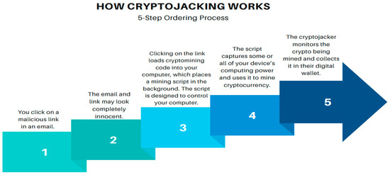 Cryptojacking: Cryptojacking is a stealthy cyberattack in which malware is injected via malicious links into a network of devices and runs covertly to harness the victim’s computing resources for mining cryptocurrencies. In 2023, cryptojacking incidents skyrocketed, exceeding the previous year’s total by early April and reaching USD 1.06 billion by the end of the year—a 659% increase [37]. Unlike ransomware, cryptojacking avoids direct payment demands and uses obfuscation to avoid detection. Figure 2 [38] illustrates this process in a step-by-step manner.