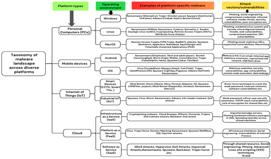 The proliferation of digital technologies has expanded the malware threat landscape across PCs, mobile devices, the IoT, and cloud systems. Understanding the targeted operating system or device is crucial for comprehending malware behavior, as malicious software often exploits system-specific vulnerabilities. In this study, “platform” and “operating system” will be used synonymously, and we classify the target platforms for malware into four primary categories: PCs, mobile devices, IoT, and cloud systems. Each platform has unique vulnerabilities, attack vectors, and security issues, which require distinct detection and mitigation strategies. This section provides an overview of the malware landscape across these platforms, as shown in Figure 3.