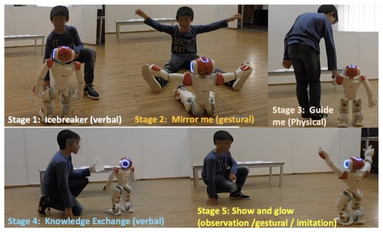 The NAO robot engaged 14 children (aged 5–8 years) in a 10 min scripted interaction. The session included five stages, as presented in Table 1.