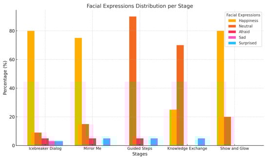 This study was approved by the University’s Ethics Committee and adheres to ethical guidelines for child studies involving AI-based interventions by using consent forms and taking into consideration data privacy, as explained in Section 2.4. To mitigate potential negative emotional responses, the system included real-time monitoring, allowing the facilitator to intervene if distress signals were detected. Additionally, parents remained present during the session, ensuring emotional security for the children. Age appropriateness was also considered: participants were aged 5 to 8 years, a range established in prior CRI studies [,]. Younger children (below 5) were excluded due to challenges in interacting with humanoid robots at a cognitive and social level.