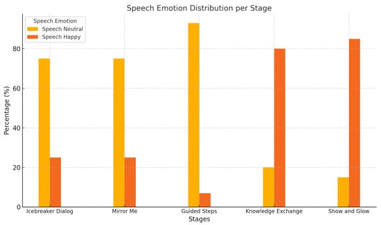 - Speech Emotion S: Speech was analyzed using a speech emotion recognition algorithm, categorizing the children feedback provided to the robot after the performed activities (stages) into positive, neutral, and negative. The emotion and tone of the child’s speech sentiment were normalized to a 1–5 scale, where 1 represented predominantly negative tones and 5 predominantly positive tones.