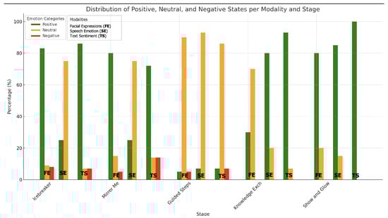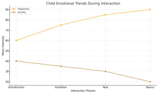The findings of this study demonstrate the transformative potential of emotion-aware technology in real-world applications, particularly in pediatric settings. By integrating affective computing techniques using biophysical data, the system effectively identified and responded to children’s emotional states during child–robot interactions. The results highlight the capability of the NAO robot to elicit positive engagement and emotional regulation across structured activities. For instance, happiness was the dominant emotion in interactive stages like “Icebreaker Dialog” and “Show and Glow”, while neutral expressions prevailed in task-oriented stages such as “Guided Steps” and “Knowledge Exchange”. Minimal occurrences of negative emotions further underscore the robot’s ability to sustain positive and neutral emotional states. Speech emotion analysis revealed a similar progression, with neutral tones dominating the early stages and a significant increase in happy speech during dynamic tasks. Text sentiment analysis corroborated these findings, showing overwhelmingly positive feedback from the children, particularly in engaging stages. These results demonstrate the potential for emotion-aware systems to improve emotional engagement and assist professionals in understanding children’s biophysical and behavioral responses. From a societal perspective, emotion-aware technology can significantly impact healthcare, education, and therapeutic interventions. By enabling robots to detect and adapt to emotional states in real time, this technology promotes emotional well-being, enhances engagement, and fosters personalized experiences, particularly for children with unique emotional or developmental needs.