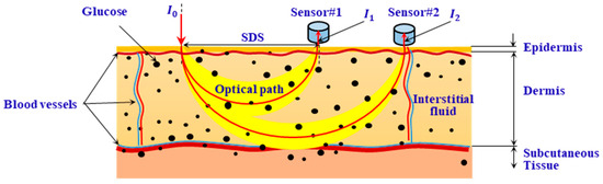 Figure 1 shows a schematic diagram of the measurement using diffuse reflectance spectroscopy. In Figure 1, represents the intensity of the incident light, and and represent the intensity of the diffusely reflected light at two SDSs ( and ) away from the incident point. The absorbances and at and can be calculated as follows: