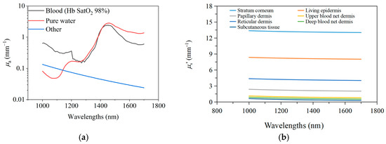 The reduced scattering coefficients of each skin layer are obtained from references [20,41,42], as shown in Figure 3b.