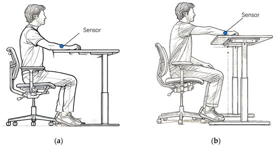 The subjects fasted for 12 h and rested in a quiet environment for at least 1 h before the experiment. A sensor was affixed to the subject’s arm. First, the subject was required to place the forearm stably on a lifting table. Then, by precisely adjusting the height of the lifting table, the subject’s forearm was brought as close as possible to the horizontal height of the heart, as shown in Figure 4a. After the subject’s forearm had been stable at this position for 4 min, skin spectra were collected and recorded as . Next, we kept the subject’s forearm in the same position on the table, and within a relatively short time interval (10 s), raised the lifting table by 20 cm, as shown in Figure 4b. After completing this operation, we collected the skin spectrum and recorded it as . The spectrum caused by blood changes was denoted as , which is calculated by the equation: